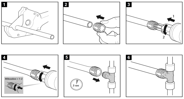 记忆紧固管件手动扩孔连接步骤: 1. (图1)直角切管,不要有毛刺; 2. (图2)把记忆环套在管子末端,顶住记忆环的限位; 3. (图3)把扩孔头插入套有记忆环的管子中,开始扩孔。每插、扩一次,松开后旋转约1/8圈,进行下一次插、扩,确保管子内壁牙口均匀,避免形成轴向沟槽。(图4)如此插、扩数次,直到套有记忆环管的端面靠在扩孔头的根部为止。 4. (图5)移除扩孔头,在记忆环收缩之前(3秒钟以内),把套有记忆环的管子迅速插入接头中,直到套有记忆环的管子端面碰到接头限位为止(图6)。 备注:电动扩孔工具自动完成上面的旋转动作,高效连接到位。 安装注意事项: 1. 在进行管路连接过程中,确保安装环境干净,避免杂质异物混入其中,造成密封不好。 2. 在进行插扩孔过程中,每插扩一次,一定要旋转一次扩孔头,避免产生轴向小沟槽 3. 避免在靠近记忆环3cm以内进行管路弯曲,以免造成记忆环附近的残余应力过大 4. 环境温度的不同,记忆紧固环的收缩速度有不同:春夏秋收缩相对较快;冬季(12月、1月、2月)收缩较慢(收缩完全到位需要最长15秒的时间)。 5. 在扩孔后,请不要把手指插入管中,以免出现危险! |
