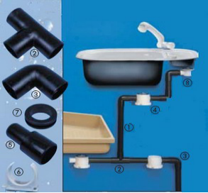 插接式下水连接件(Plug-In Water Fittings) 20431– ① 污水管(Tube)Ø 28mm x 1m 20432 - ① 污水管(Tube)Ø 28mm x 2m 20433 – ② T 接头 (Tee) 20434 - ② Y 接头 20435 – ③ 90°弯头 20436 - ③ 45°弯头 20437 - ③ 对接头 | 20438 – ④ 清理盒 20439 – ⑤ 转接头(转为3/4”) 20421 – ⑥ 管卡 20422 – ⑦ 污水箱密封件(污水管与污水箱连接密封) 20423 – ⑧ 直下水口 Ø 28mm 20424 – ⑧ L下水口 Ø 28mm 20425 – ⑧ 双出口下水口 Ø 28mm | |