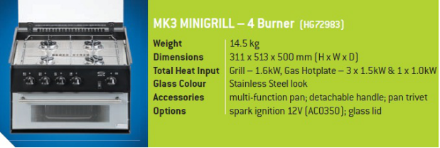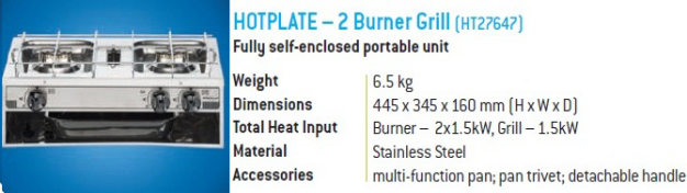 50170 燃气灶 4 x 1.5Kw, 6.5 kg H470 x W570 x D88 mm | 50180 燃气灶 2 x 1.5kW,3.0 kg H400 x W275 x D88 mm | 50190 燃气灶 2 x 1.5kW & 1 x 2.5Kw,10.6kg H546 x W476 x D114 mm |