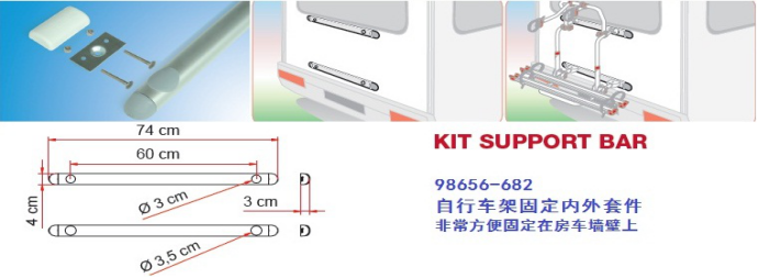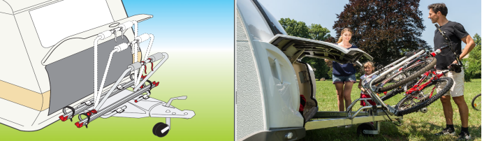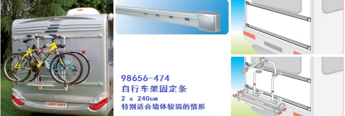 70586 拖挂车XLA自行车架(2辆),承载35kg 70587 拖挂车XLA PRO自行车架(2辆),最多载3辆(另购固定臂和轨道),承载50kg 70588 拖挂车XLA PRO 200自行车架(2辆), 承载50kg 特别备注:XLA适合所有标准拖挂底盘A架、Hobby加长、新Al-Ko底盘;XLA PRO以及XLA PRO 200适合所有标准拖挂A架、Hobby加长、新Al-Ko底盘,不用卸载自行车也能轻松开启A架前的舱门;Hobby(豪彼)、Bürstner(宾士盾)等拖挂房车后壁已预装自行车架型材条,需要加装自行车架,请单独联系。 |